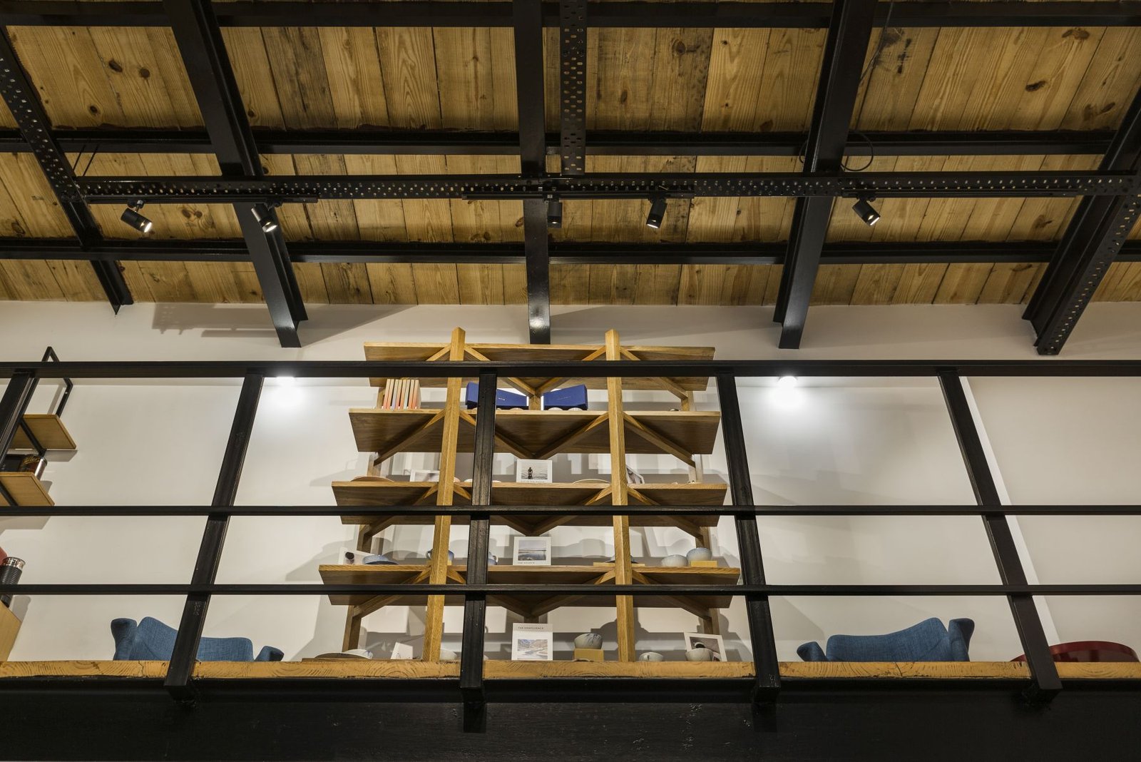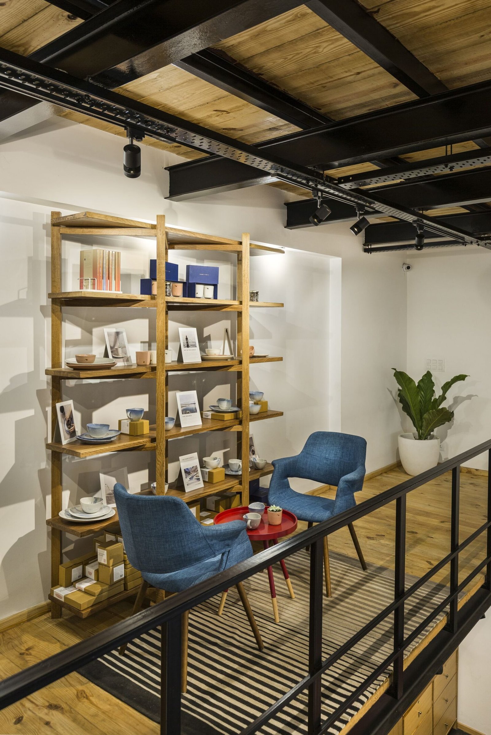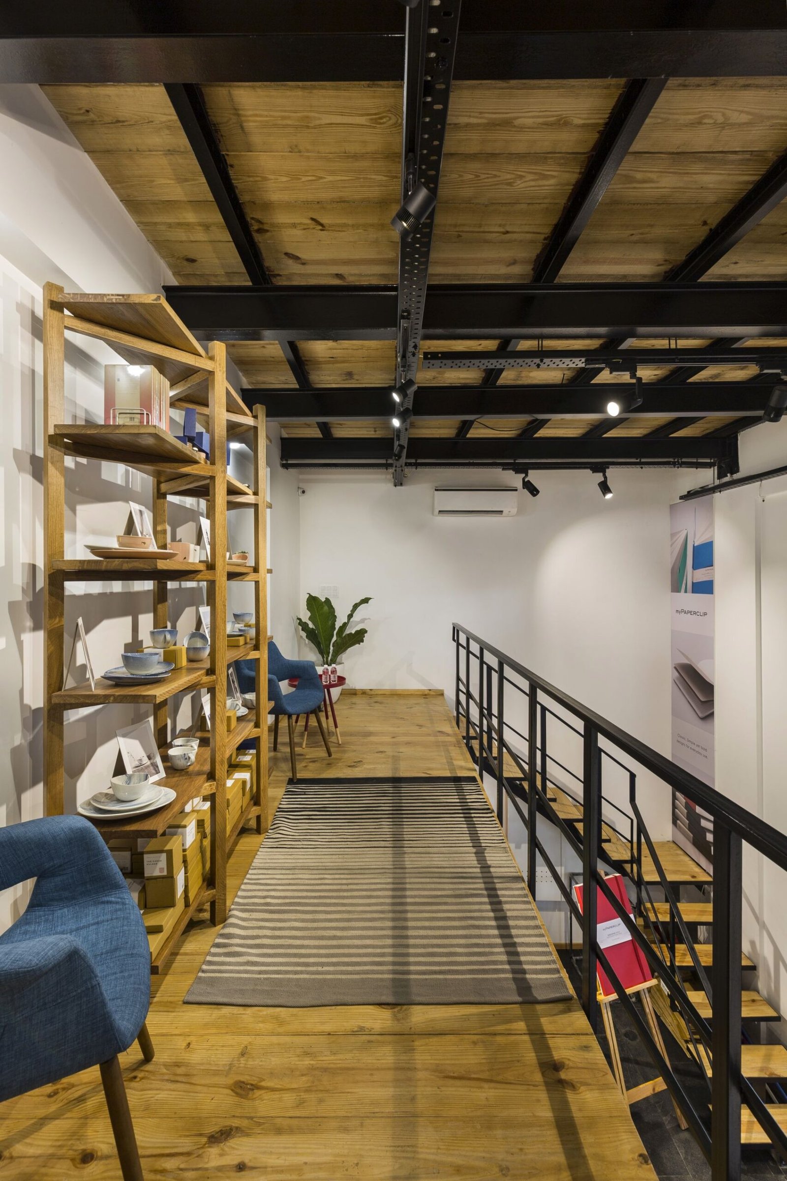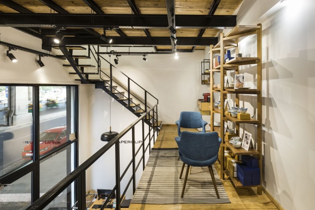It consists of a retail space on the ground floor and a design studio on the mezzanine level. Both the spaces are connected with a mid-level transition bridge which acts like a discussion cum display area. From a compact 300 sq ft space, the levelled planning was able to extract approximately 850 sqft area spread across 2.5 levels. The double-height entrance and the visual interaction between the mid mezzanine and retail area adds to the unique experience of the space.