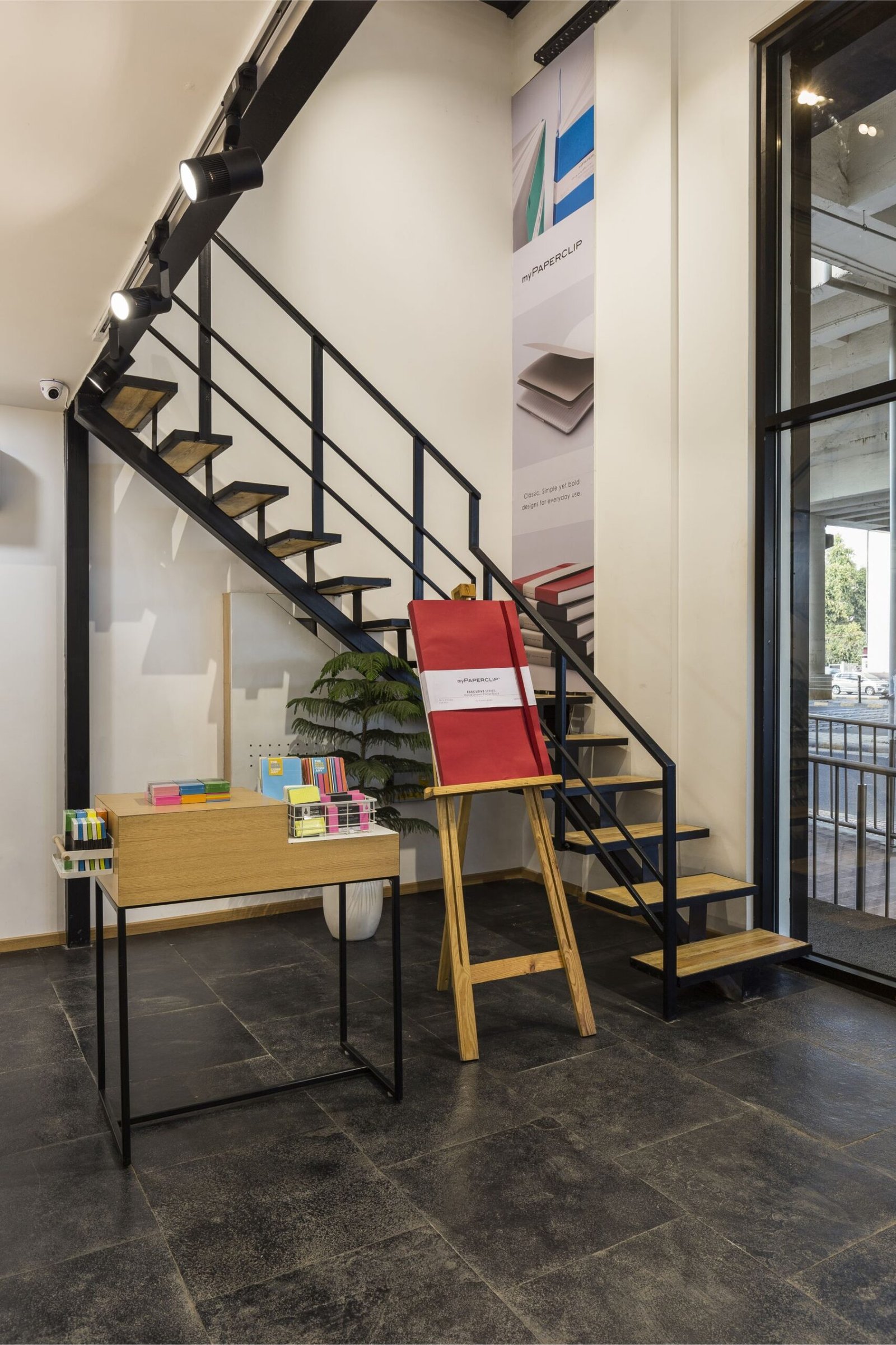 The brand identity echoes throughout the design language of the experience centre, where each speck and corner reflects chic and minimalism. The fresh and vibrant colours of the stationery products enjoy more than just a glance as they sit against the muted backdrop of white, beige and grey furnishings and furniture. Exposed metal structure, staircase and railing with a solid wood flooring cohesively bring the space together to create a mindful experience, one that shuts off the mindless noise, the auto-pilot of the routine.
