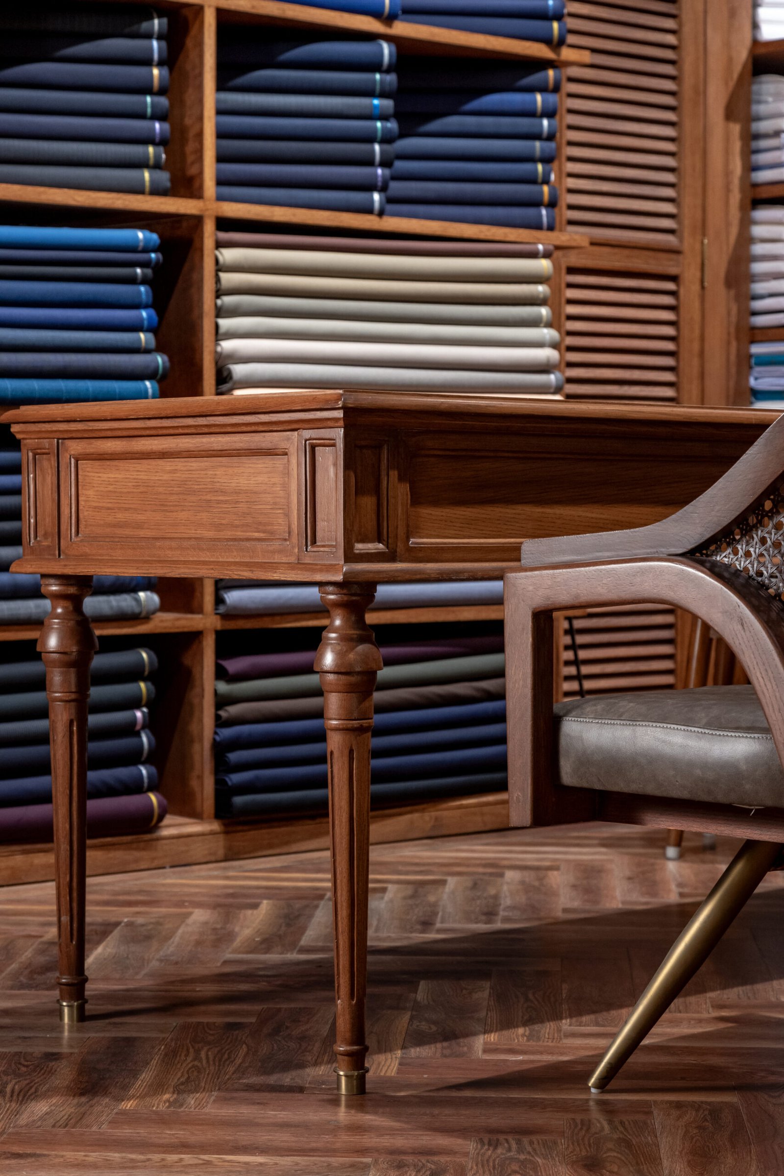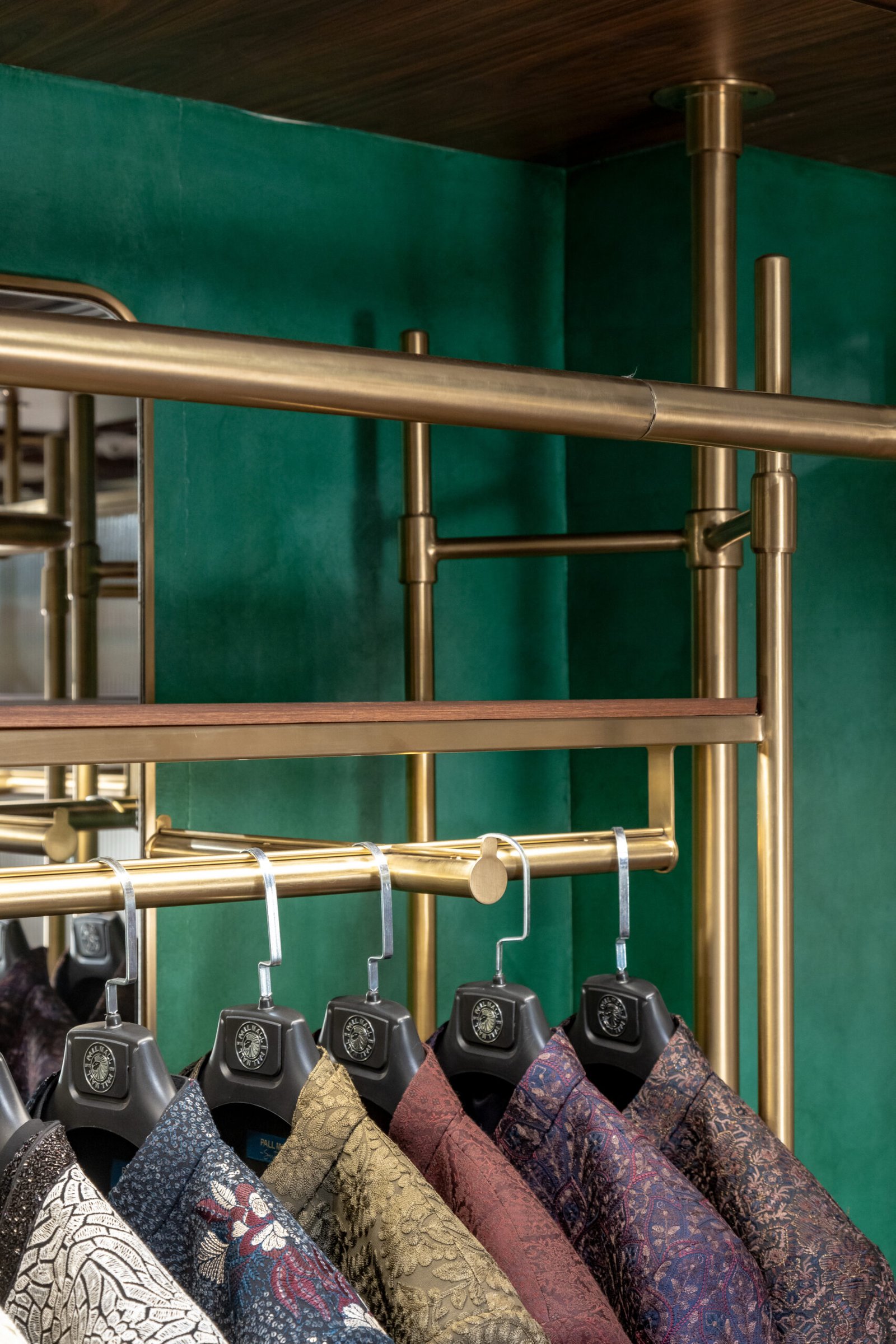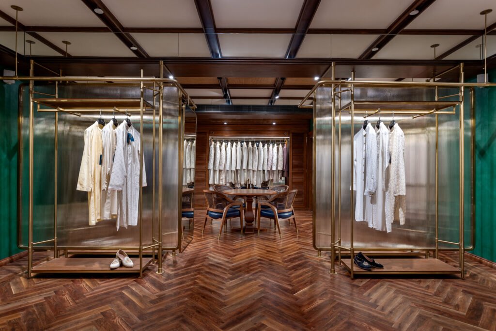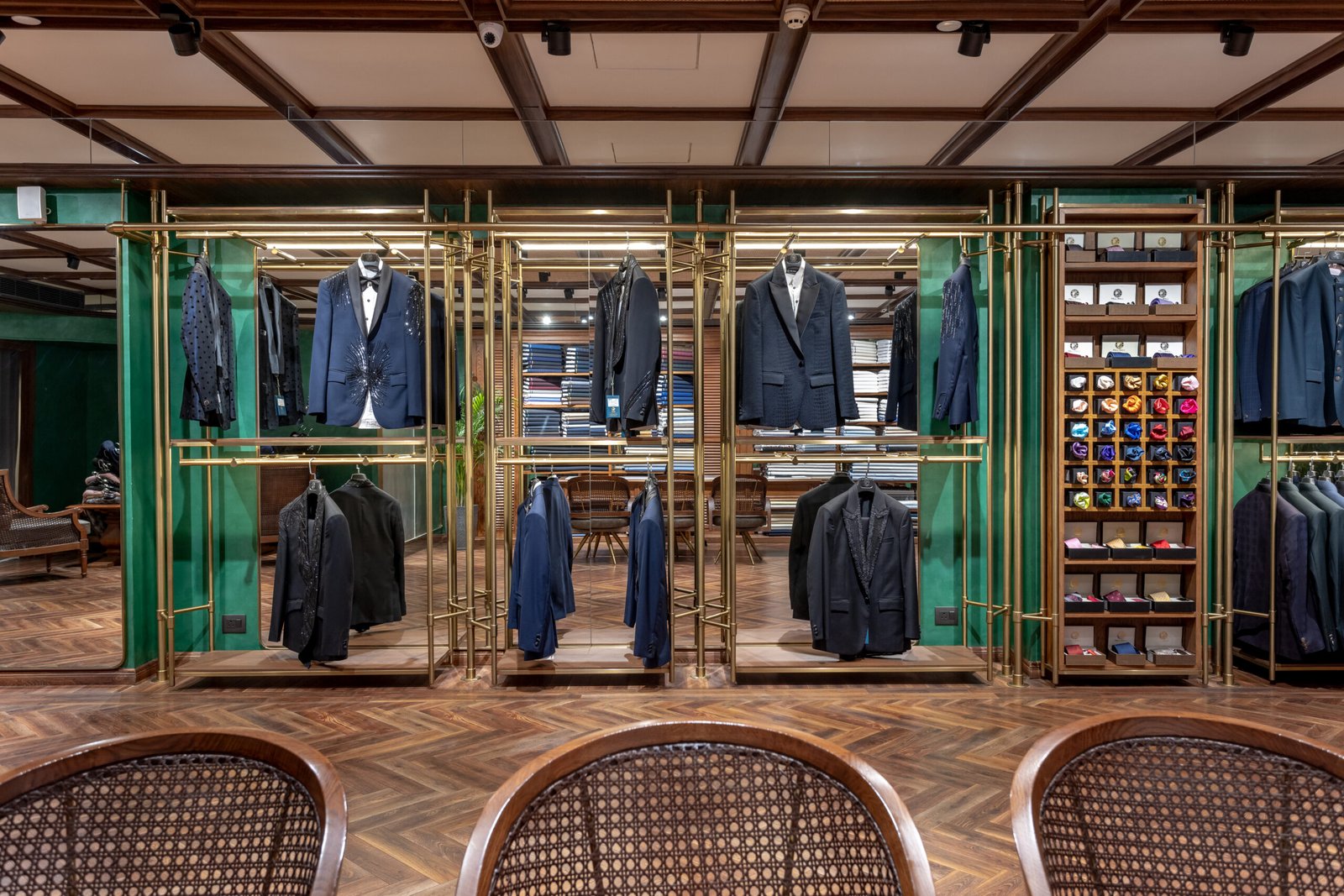 The store’s layout is divided into distinct zones, each serving a specific purpose. The ground floor houses fabrics, ready-to-wear Indian and English formal wear, while the mezzanine level is dedicated to customised Indian ethnic wear. This strategic zoning allows for a clear, intuitive shopping experience, creating clear circulation paths and merchandising zones.