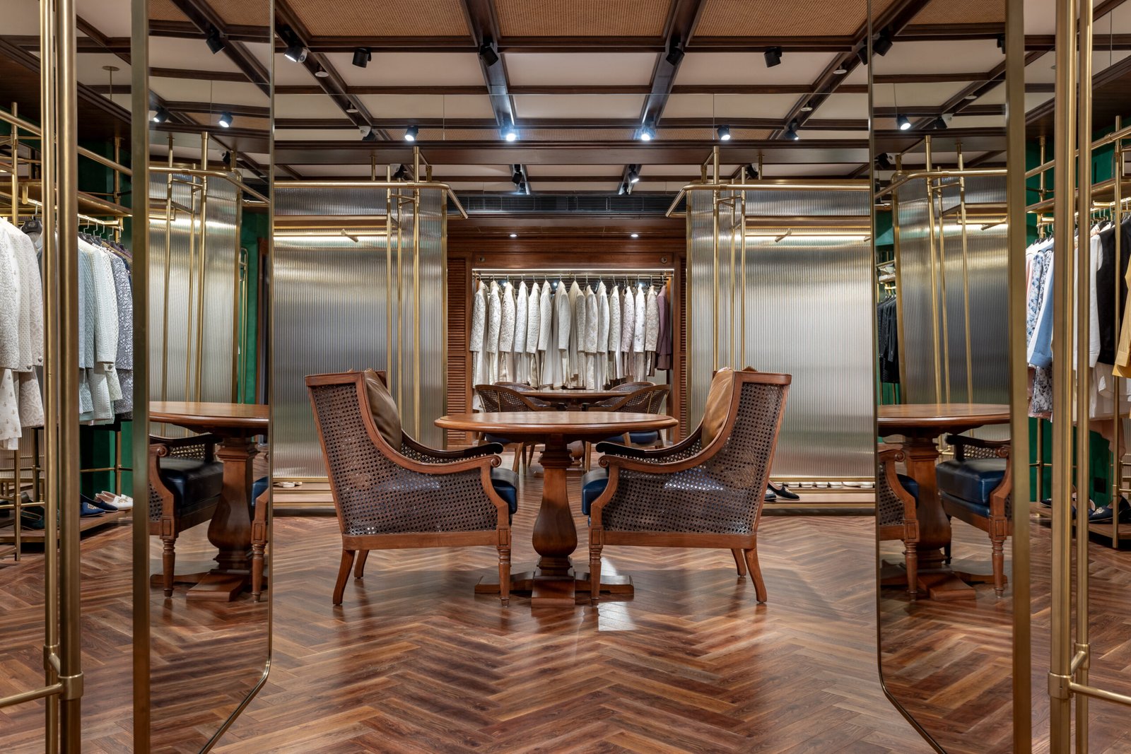 The material palette reflects the brand’s premium positioning through the calculated use of materials. Wood, mirrors, and metallic accents create a luxurious atmosphere. The leather upholstery, fabric racks, and display systems maintain consistency with established brand guidelines, referencing solutions developed for Pall Mall, Noida.