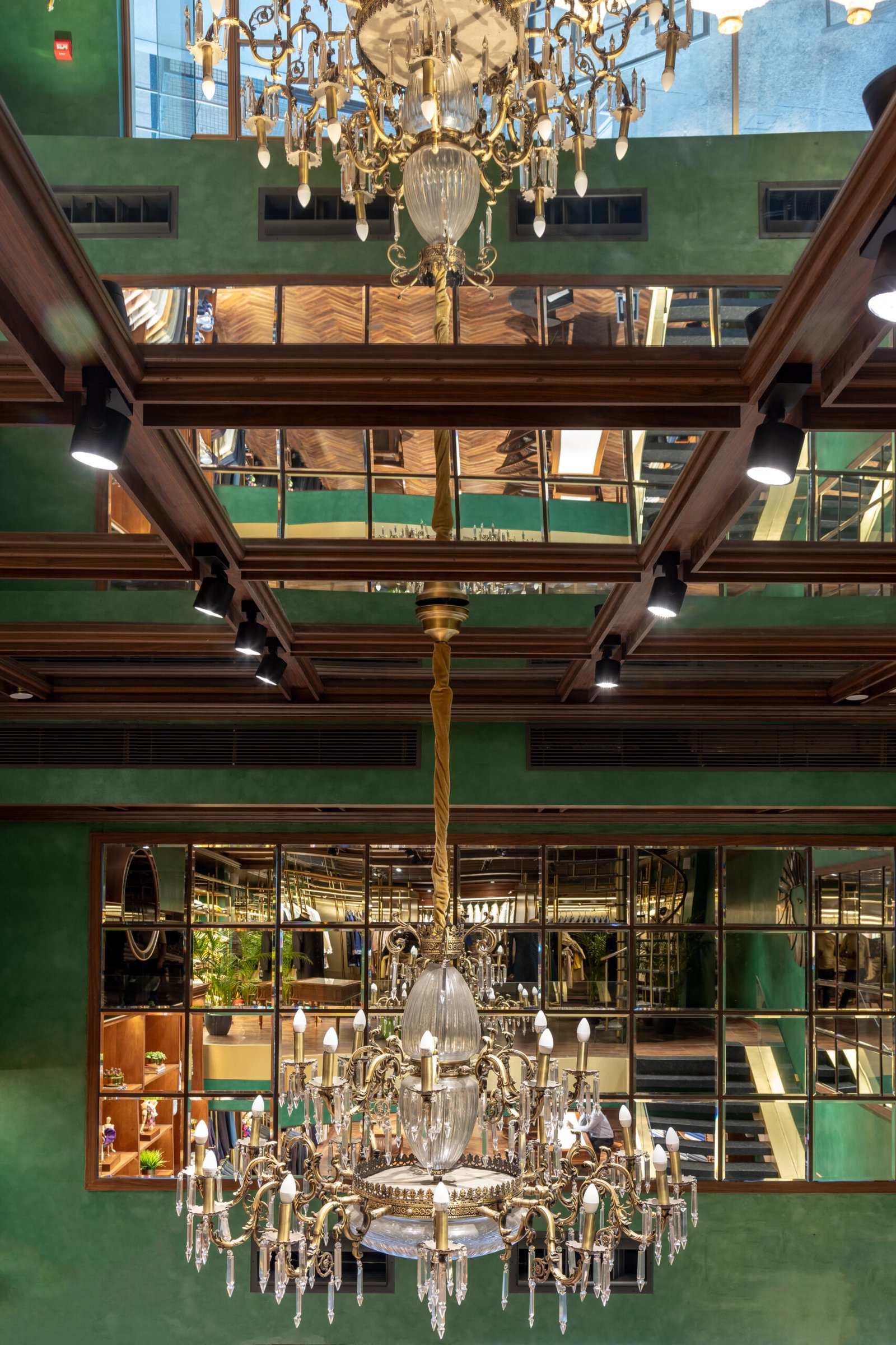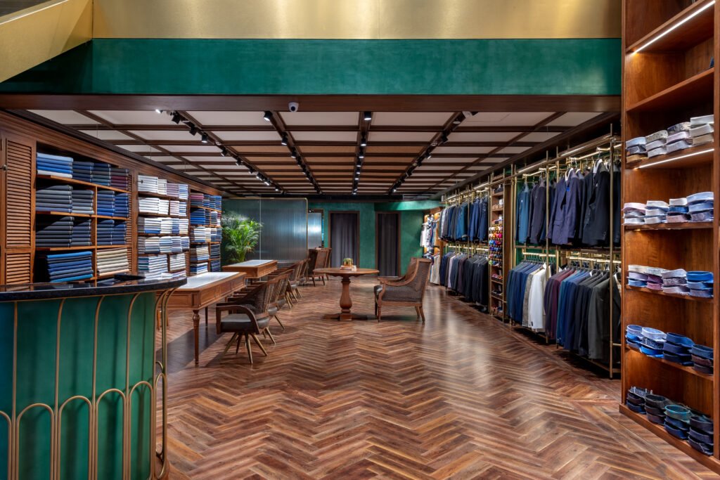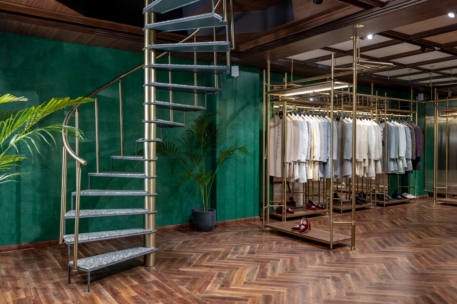 The store is a two-level space spanning approximately 3,500 square feet. A double-height entrance immediately creates a sense of grandeur. This is further enhanced by the treatment of the interior walls, which feature a premium green colour executed in textured paint, maintaining an understated elegance.