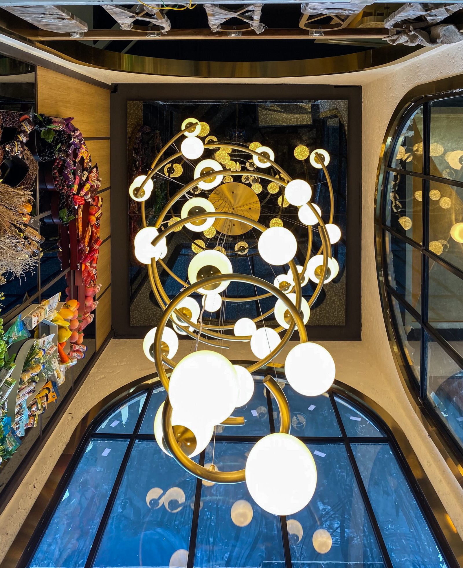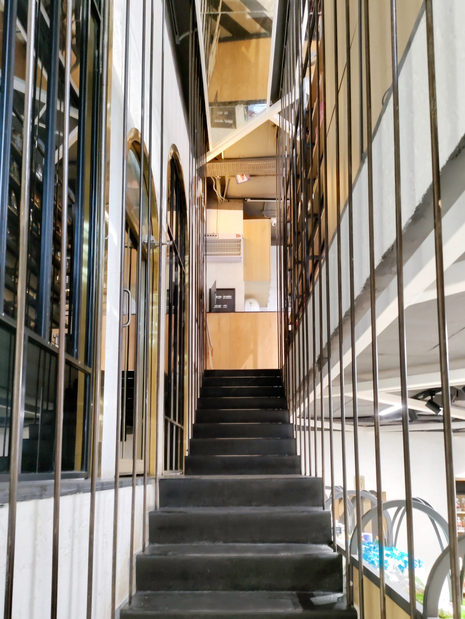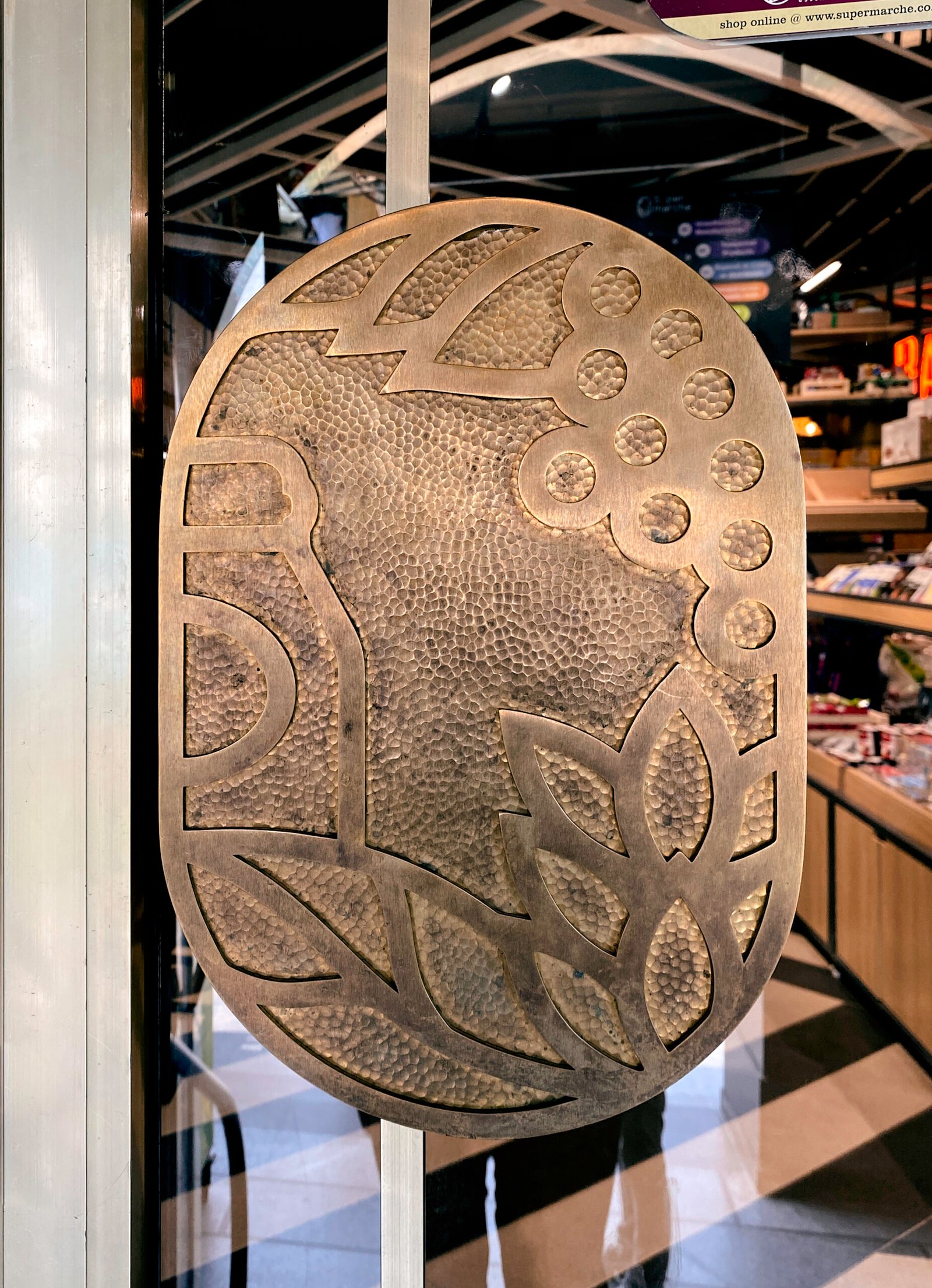 The design is a reinterpretation of modern classical and therefore has minimal accents fused with eclectic design elements such as the double-height chandelier and the veggie wall-art logo at the entrance. Taking advantage of the store’s location opposite a canal, a juice counter was introduced for the cyclists in an attempt to increase the visibility of the store. To aid the user with a premium shopping experience, the store’s exposed ceiling was accentuated by rafters and mirrors that increase reflection. The flooring adorns a dynamic, striped Zebra pattern that helps in tying the elements of the ceiling with the flooring—bringing cohesion and harmony to the look and feel of the space. An 8 mm thick metal folded staircase was designed to facilitate easy user movement despite the restricted space. Grey metal and brass finish accents add an opulent vibe to the otherwise minimal design palette of the store.