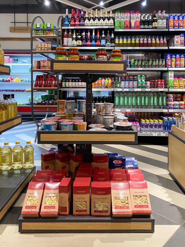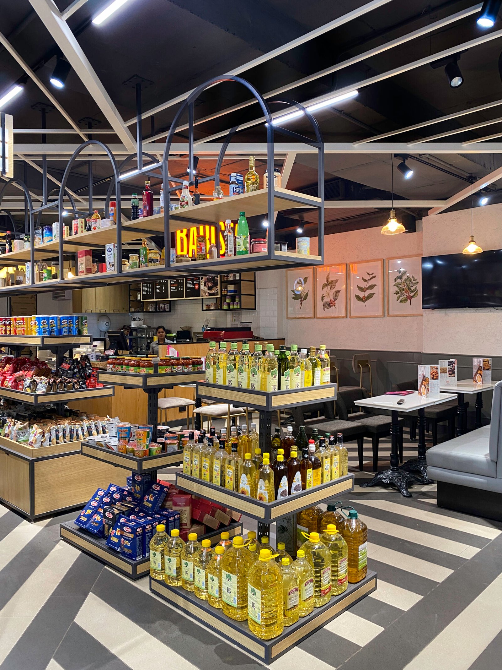 SuperMarche—a one-of-its-kind prototype in Punjab sources local produce from the farms and delivers it all over Punjab—championing the cause for going vocal for local and supporting small farmers. Such a special cause needed special storage ideas. The studio was quick to adapt and introduced flexible, modular storage. The wooden laminated shelves with metal frames have adjustable flexible heights that fit the store’s multi-occasional display requirement. Gondolas or suspended racks adorn the ceiling while aiding in efficient product display. Since it was important to find a way to temper consumer anxiety and minimize the risk while shopping, the studio developed an arrangement of compartmentalization for various foods such as keto, vegan etc. Even the dry fruit section was equipped with a dispenser system.