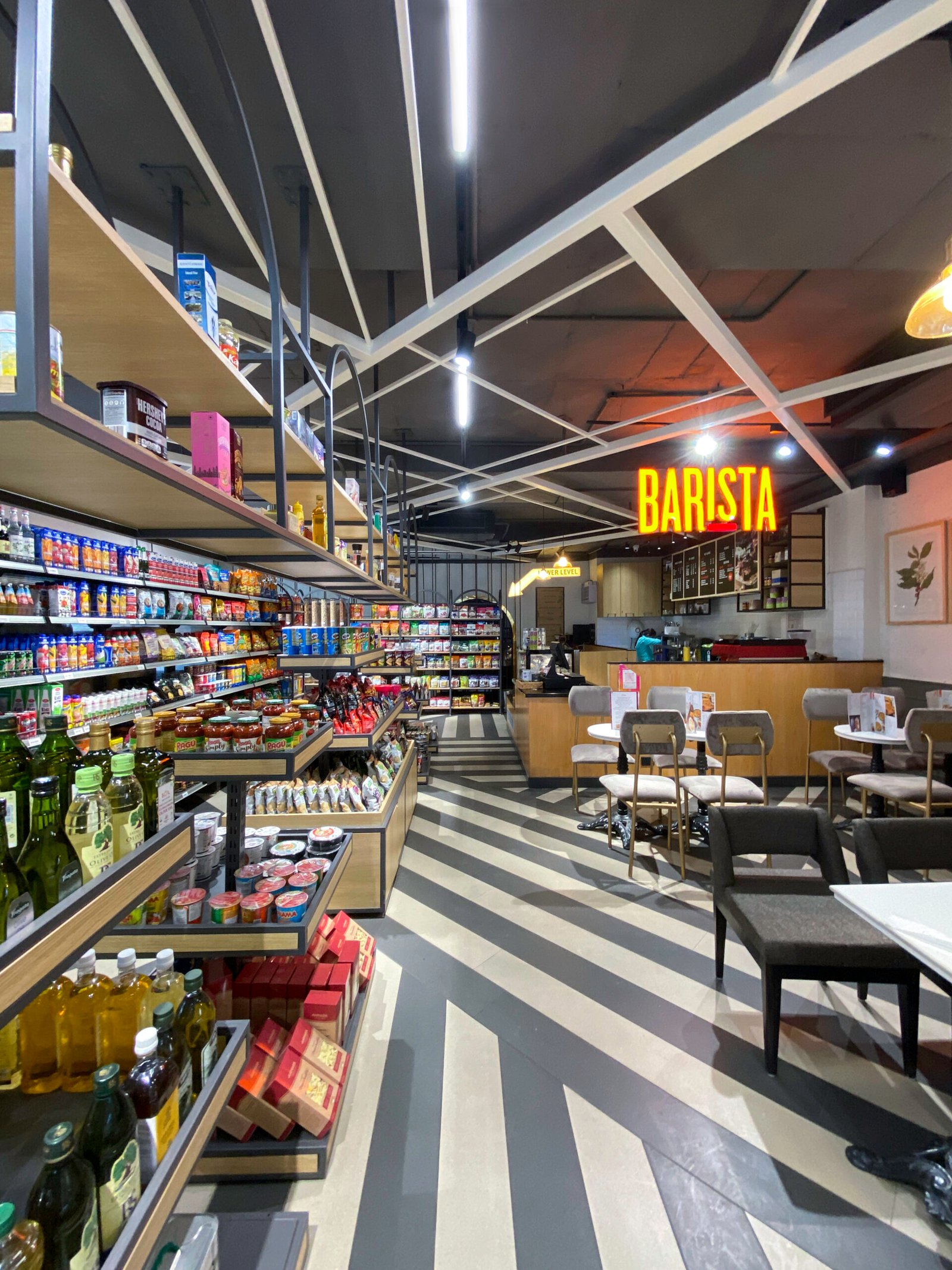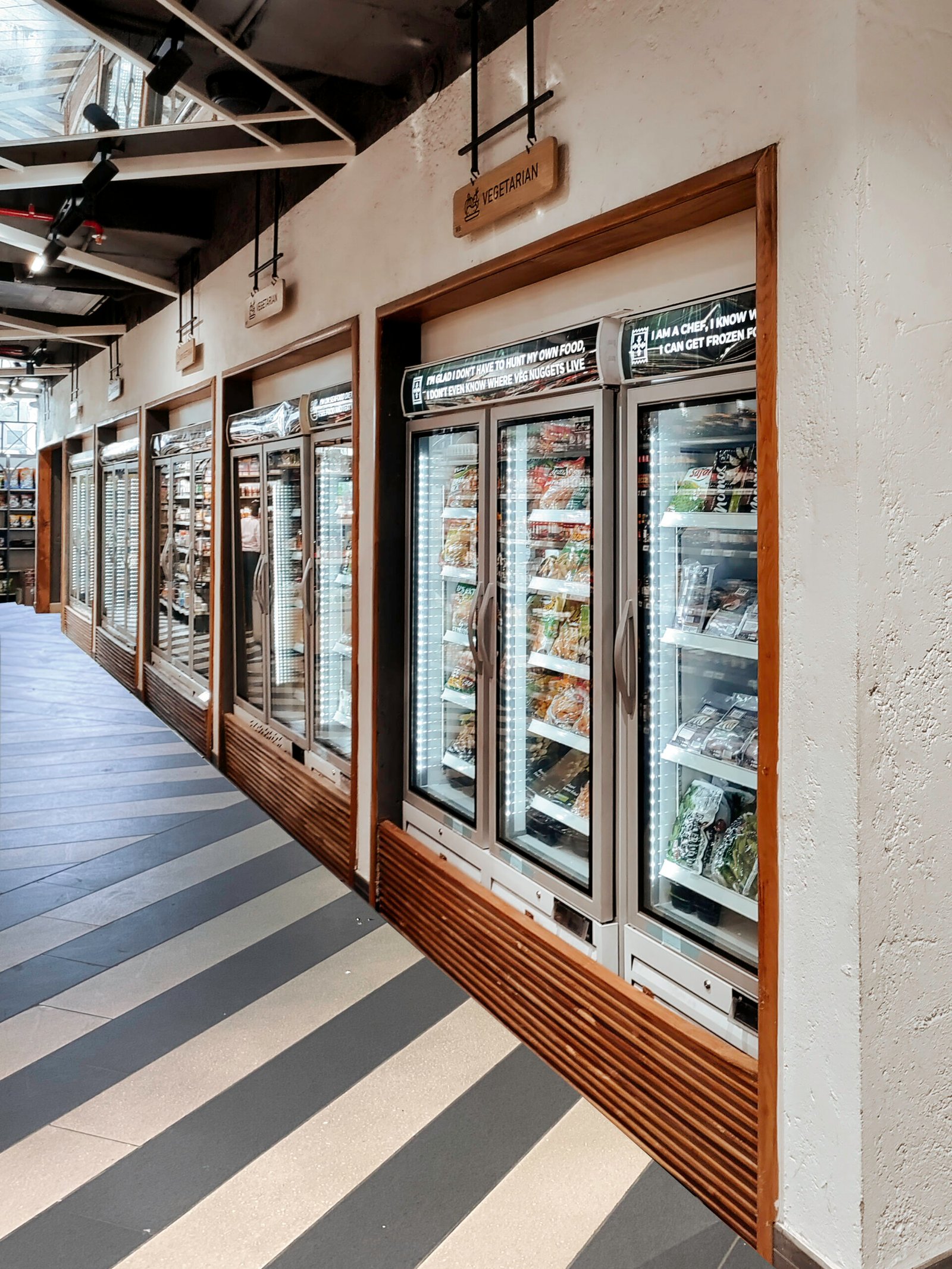 To bring some normalcy to the shopping experience, one which was reminiscent of a pre-covid era, a barista was introduced inside the store for the users to enjoy coffee while shopping. In the same vein, a cheese counter and a salad bar were added to refine the premium shopping experience. Considering the need for a contactless user experience post-covid, fast buy kiosks were installed in the store. The user can order all groceries from a screen and pick up the same from the stall as well as via a customised app for the store and self-checkout; thereby avoiding the need to browse through shelves altogether.